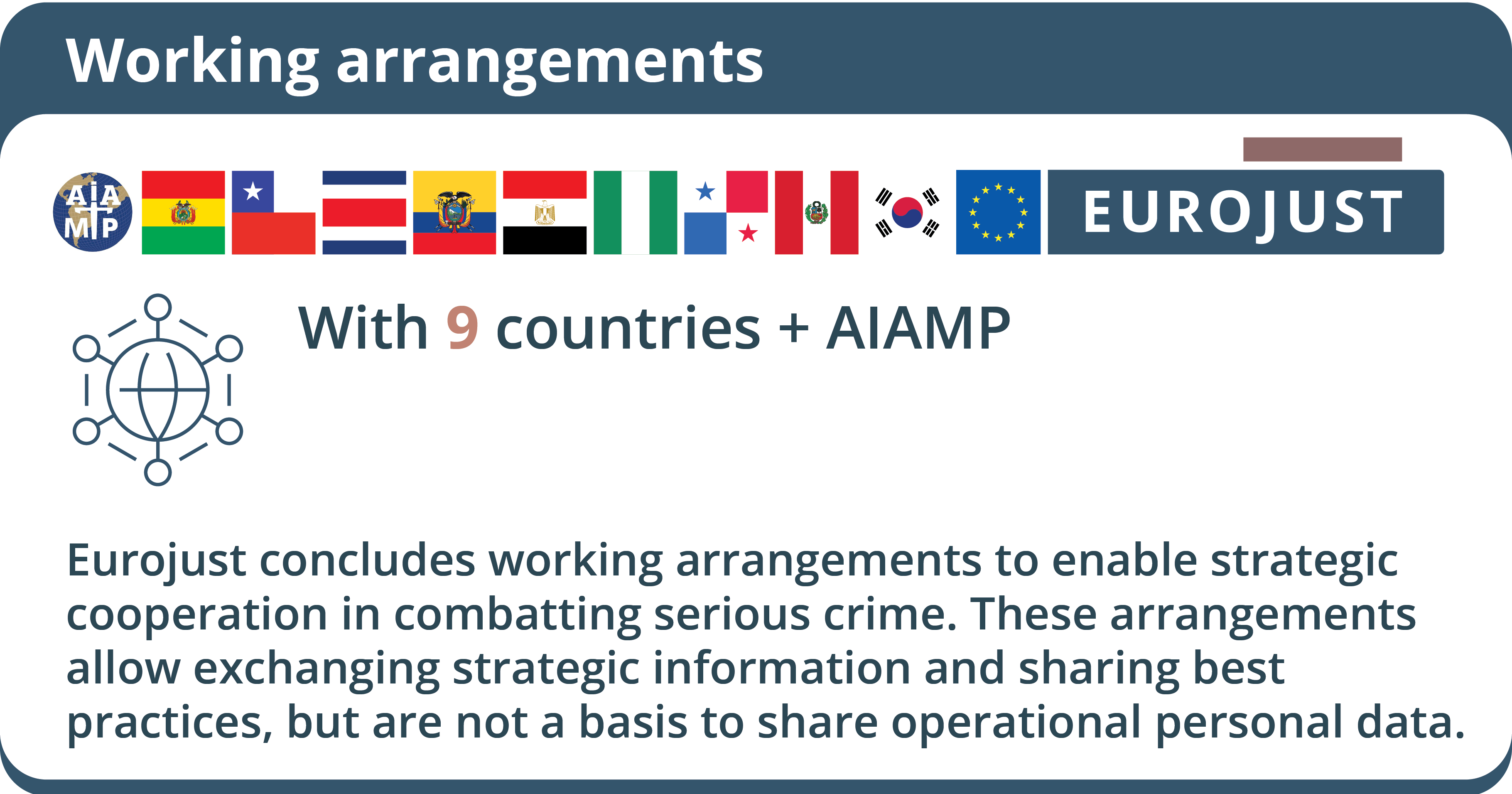 Eurojust concludes working arrangements with third countries, as well as with international organisations and judicial networks and associations established outside of the EU to enable closer cooperation in combatting serious crime on a strategic level.