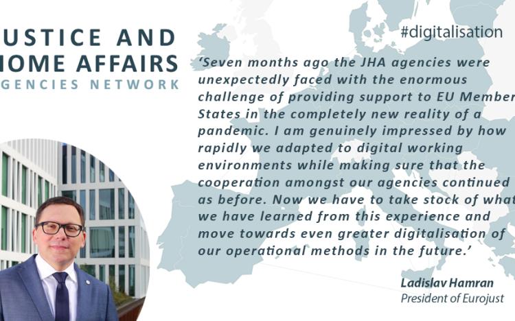 Eurojust President Mr Ladislav Hamran said: ‘Seven months ago the JHA agencies were unexpectedly faced with the enormous challenge of providing support to EU Member States in the completely new reality of a pandemic. I am genuinely impressed by how rapidly we adapted to digital working environments while making sure that the cooperation amongst our agencies continued as before. Now we have to take stock of what we have learned from this experience and move towards even greater digitalisation of our operational methods in the future.’