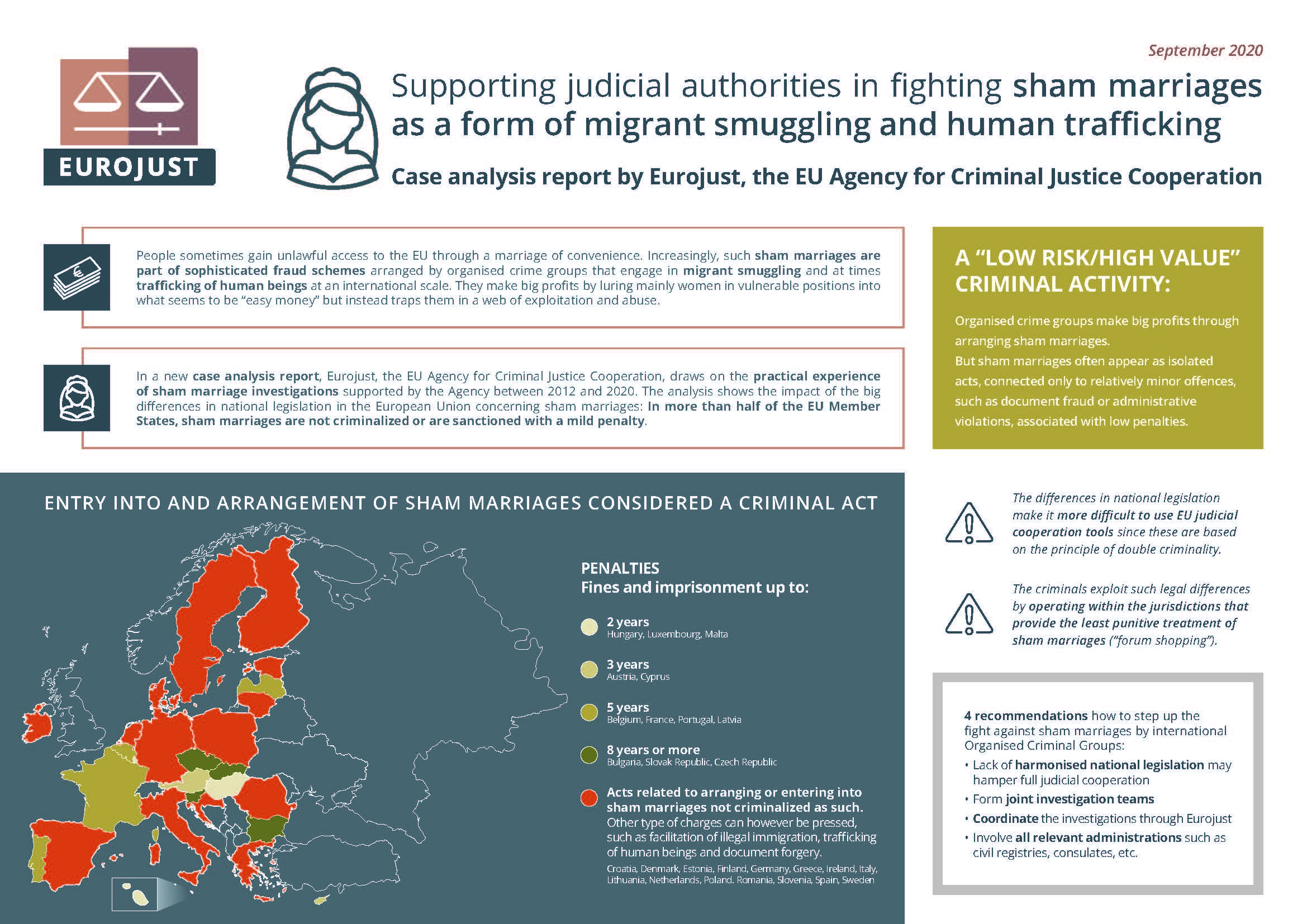These victims are lured into what seems to be “easy money”, but instead become trapped in a web of exploitation and abuse. Sham marriages are also a direct abuse of the fundamental right to freedom of movement within the EU while also creating, for instance, unwarranted access to the European labour market and social security benefits in the Member States. Since 2012, the EU has therefore firmly stressed the importance of effective cooperation in tackling marriages of convenience, the arranging of which has recently been identified by the European Commission as one of the three main forms of facilitating irregular migration into the EU. The Eurojust report goes deeper into the assistance provided between 2012 and 2020 to the present day.
