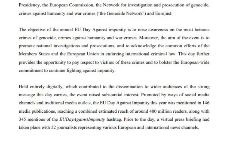 The objective of the annual EU Day Against impunity is to raise awareness on the most heinous crimes of genocide, crimes against humanity and war crimes. Moreover, the aim of the event is to promote national investigations and prosecutions, and to acknowledge the common efforts of the Members States and the European Union in enforcing international criminal law. This day further provides the opportunity to pay respect to victims of these crimes and to bolster the European-wide commitment to continue fighting against impunity.