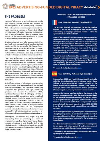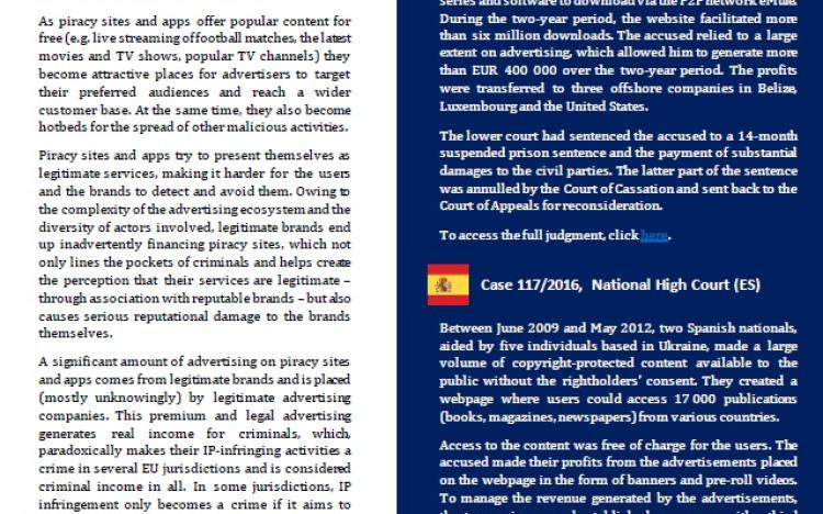 The use of advertising to fund websites and mobile apps that offer pirated content has become an insidious practice within the online piracy landscape. This flyer gives an overview of the scale of the problem, the actors operating within the advertising ecosystem, and the types and formats of advertising. It also discusses links to malvertising and other crimes. Finally, the flyer presents national case-law examples and existing EU initiatives to combat advertising on piracy sites.
