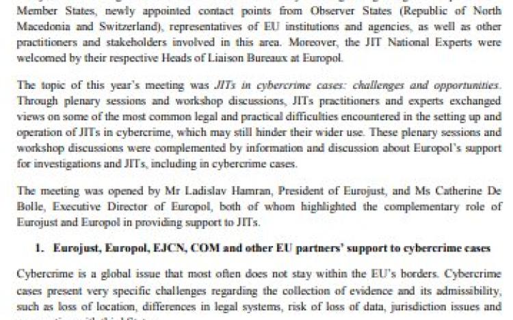 The topic of this year’s meeting was JITs in cybercrime cases: challenges and opportunities. Through plenary sessions and workshop discussions, JITs practitioners and experts exchanged views on some of the most common legal and practical difficulties encountered in the setting up and operation of JITs in cybercrime, which may still hinder their wider use. These plenary sessions and workshop discussions were complemented by information and discussion about Europol’s support for investigations and JITs, including in cybercrime cases.