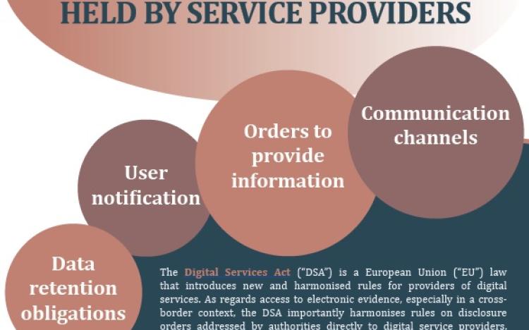 The Digital Services Act (DSA) is a European Union (EU) law that brings updated and harmonised rules for providers of digital services. As regards access to electronic evidence, especially in a cross-border context, the DSA importantly harmonises rules on disclosure orders addressed by authorities directly to digital service providers, including the obligation to notify the user, sets out new communication channels and introduces specific data retention obligations.