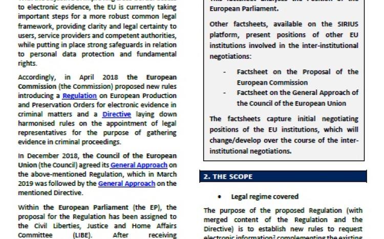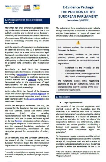 This document analyses the position of the European Parliament towards the E-Evidence Package at the initial stage of the negotiations. It provides information on the background of the E-Evidence Package, the scope of its application, the toolbox that it will offer to competent authorities and its effects on the different actors involved (issuing state, enforcing state, service providers, and users).