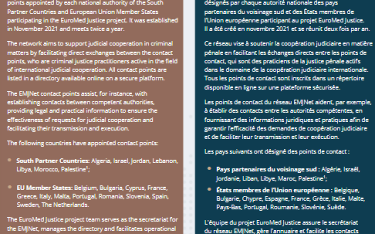 The EuroMed Justice Network (EMJNet) is a network of contact points appointed by each national authority of the South Partner Countries and European Union Member States participating in the EuroMed Justice project.