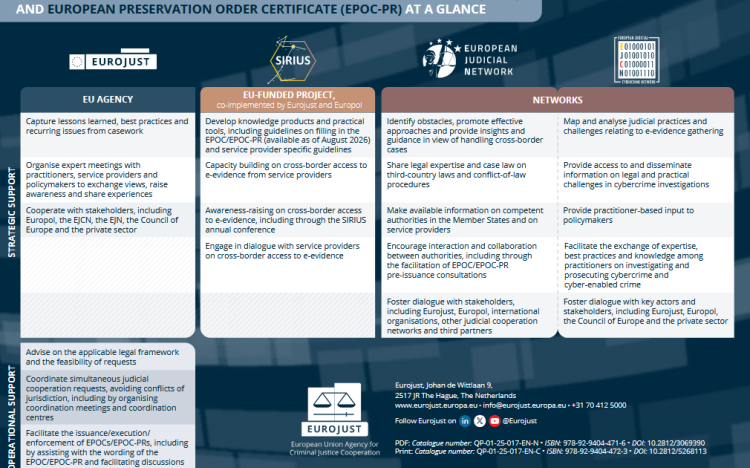 This leaflet summarises the operational and strategic support that Eurojust, the SIRIUS project, the European Judicial Network and the European Judicial Cybercrime Network can provide to practitioners in the use of these new legal tools.