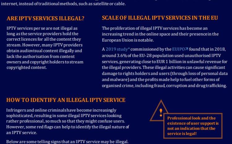 Internet Protocol Television (IPTV) is a technology that enables the broadcasting of television content through the internet, instead of traditional methods, such as satellite or cable. The proliferation of illegal IPTV services by providers without the correct licenses has become an increasing trend in the European Union. These illegal activities can cause significant damage to rights holders and users (through loss of personal data and malware), and the profits generated can fuel other forms of organised crime, including fraud, corruption and drug trafficking.