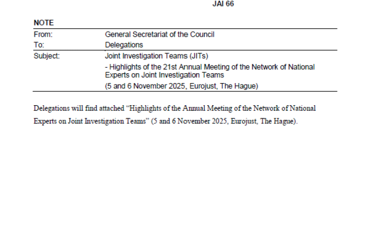 The 21st Annual Meeting of the Network of National Experts on Joint Investigation Teams (JITs) took place at Eurojust’s headquarters from 5-6 November 2025. This year's event focused on two key themes: the forthcoming JITs Collaboration Platform and the role of customs authorities in cross-border investigations. Organised by the JITs Network Secretariat in collaboration with Eurojust and Europol, more than 80 participants attended the event, including 32 JIT National Experts alongside representatives from the European Commission, eu-LISA, ICC-OTP and OLAF.