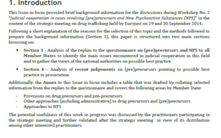 This Issue in focus provided brief background information for the discussions during Workshop No. 2 “Judicial cooperation in cases involving (pre)precursors and New Psychoactive Substances (NPS)” in the context of the strategic meeting on drug trafficking held by Eurojust on 29 and 30 September 2014.