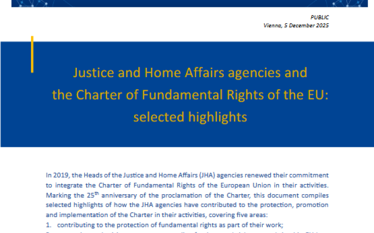 On the 25th anniversary of the proclamation of the EU Charter of Fundamental Rights, JHA agencies published this joint report with practices and examples of how the Charter is integrated into the Agencies’ policies and programmes in fundamental rights protection in regular operations, training, gender equality and diversity initiatives and compliance mechanisms.