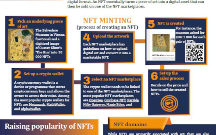 This flyer describes the growing use of non-fungible tokens (NFTs) in the art world. These unique identifiers recorded on blockchain are used to verify the ownership and authenticity of a work of art. While the use of NFTs by artists is increasing, so is the risk of criminal actions related with them. One example of such abuse is converting artwork to NFT and selling it without the artist's authorisation.