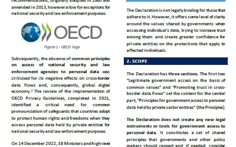 On 14 December 2022, 38 Ministers and high-level representatives of the Organisation for Economic Co-operation and Development (OECD) Members and the European Union adopted the Declaration on Government Access to Data Held by Private Sector Entities (Declaration). Although not legally binding, the Declaration offers a level of clarity around the values shared by governments when accessing individuals’ data, trying to increase trust among themselves and create greater confidence for private entities on the protections that apply to affected individuals. The central part of the Declaration are the principles for government access to personal data held by private sector entities when pursuing law enforcement and national security purposes.