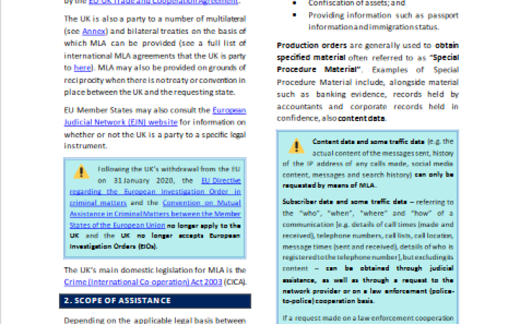This document analyses the process of requesting Mutual Legal Assistance (MLA) in criminal matters from United Kingdom (UK) authorities, particularly focusing on the gathering of electronic evidence. It provides information on the basis for cooperation, scope of assistance, requirements for MLA requests (including for specific types of requests), grounds for refusal and the different UK Central Authorities and their distinct responsibilities. It also includes a list of international agreements on the basis of which MLA from the UK can be requested.