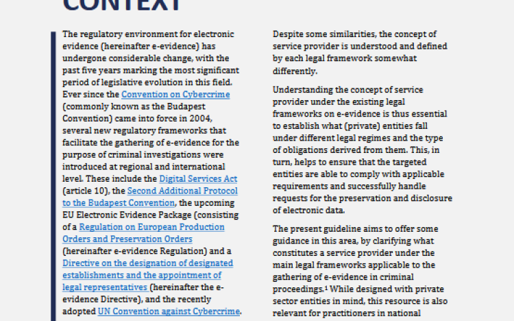 Central to all the existing e-evidence regimes are service providers. Despite certain similarities, the notion of service provider is defined and understood somewhat differently across the various legal frameworks on e-evidence. This guideline aims to clarify the concept of service provider under the main legal frameworks governing the collection of electronic evidence in criminal proceedings. Although primarily designed for private sector entities, this resource is equally relevant for practitioners in judicial and law enforcement authorities.