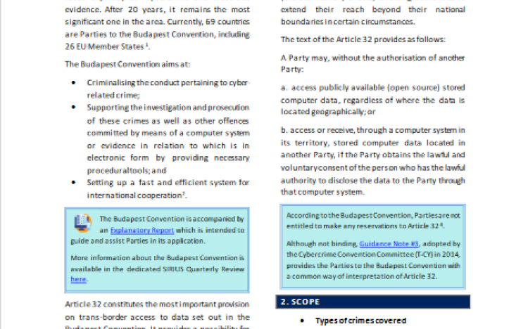 This document analyses the toolbox available to competent authorities under Article 32 of the Budapest Convention, including the requirement of “lawful and voluntary consent” as referred to under Article 32(b). It also includes excerpts from the legislation of some EU Member States implementing Article 32 into their domestic legal framework and information on some EU countries where the provision is directly applicable into national law.