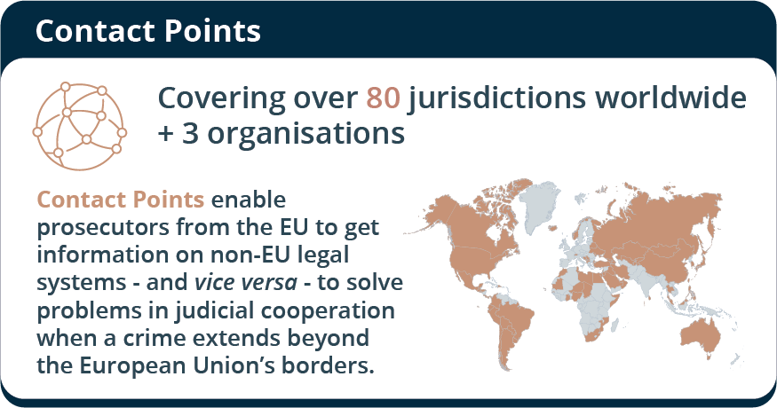 Third countries may appoint Contact Points for their relations with Eurojust. The Contact Points enable Eurojust and the competent authorities in third countries to establish rapid contact and assist each other when a crime extends beyond the European Union’s borders. Over 80 countries and 3 organisations have appointed Eurojust Contact Points.